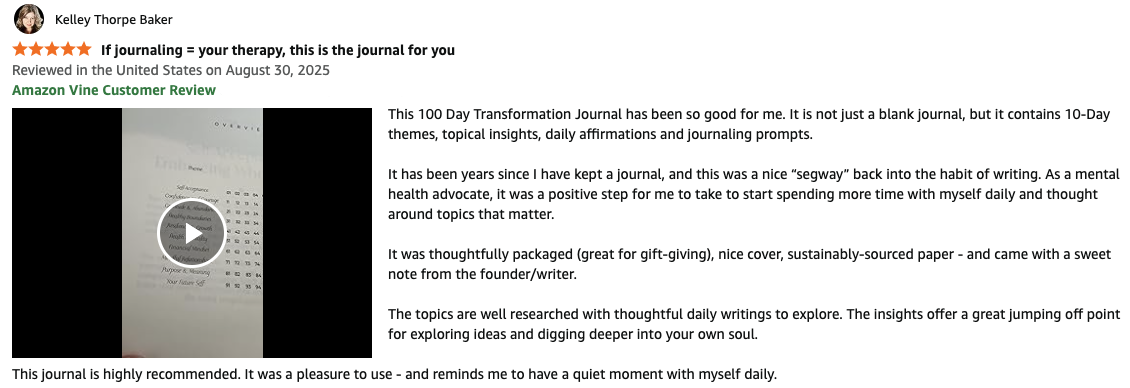 The Transformation Journal is your 100-day companion on the journey to mindset shifts, deep healing, and personal growth. Thoughtfully designed to support you every step of the way, this journal offers a daily theme to inspire reflection, gentle guidance to nurture your inner world, a powerful affirmation to anchor your energy, and a meaningful prompt to spark deeper self-awareness.
