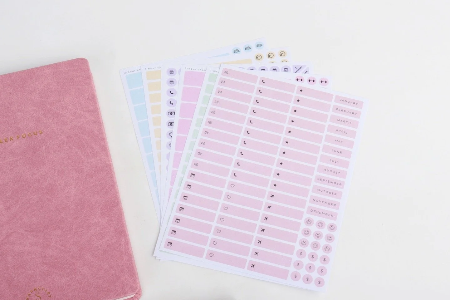 The stickers are designed to make planning more fun, personalized, and visually engaging —and you can even write on them! Use them to highlight important tasks, mark milestones, set reminders, or just add a splash of motivation to your pages. The 1-hour and 2-hour chunks are perfect for highlighting blocks of time in your daily schedule. Use these stickers to visually block off specific periods for focused work, meetings, self-care, or any other activities that need dedicated time.