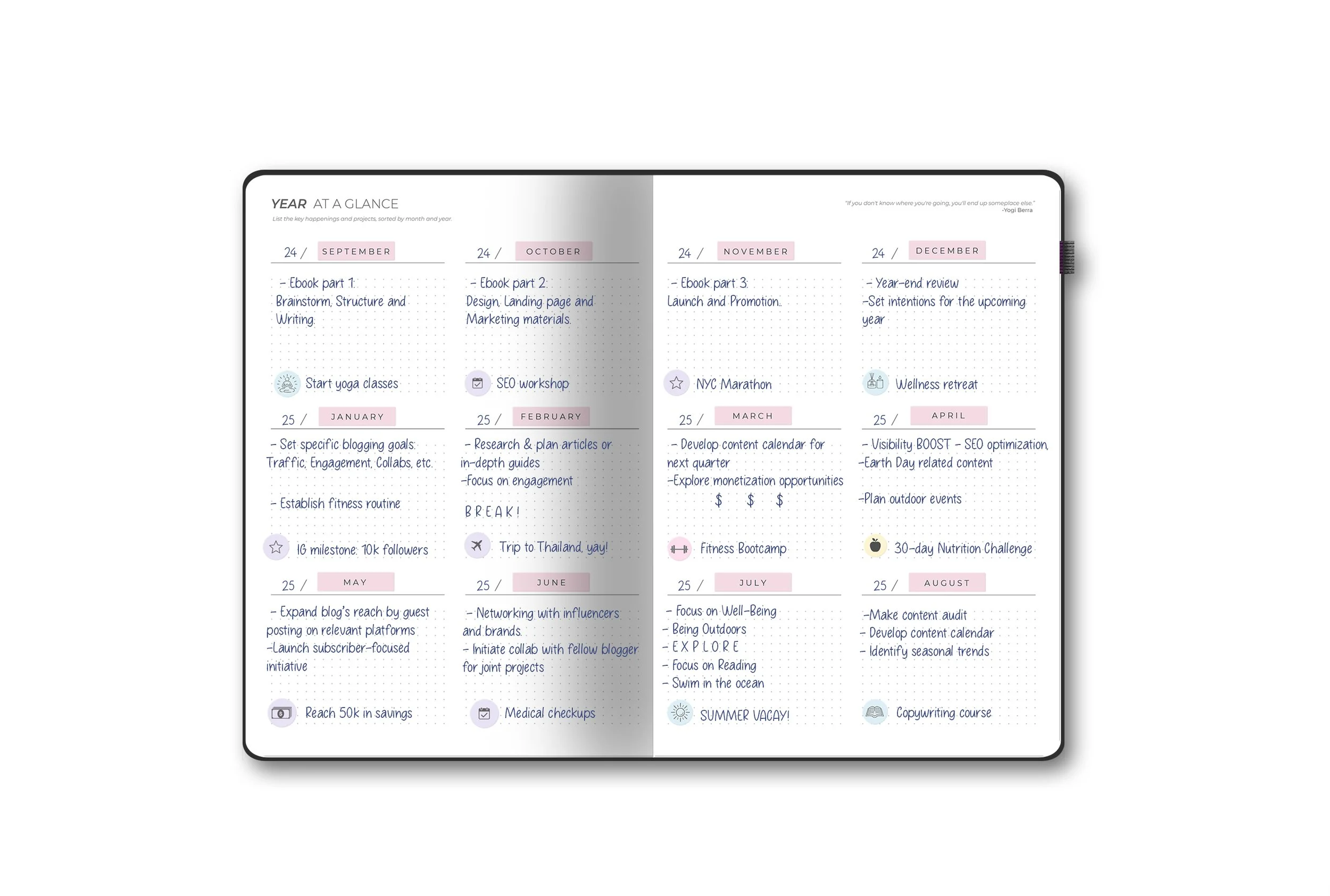 Leave your planner on your desk, kitchen counter, or nightstand. Seeing it often keeps your goals top of mind and gives you a visual reminder to take action. Out of sight often means out of mind—so keep it in your line of vision.