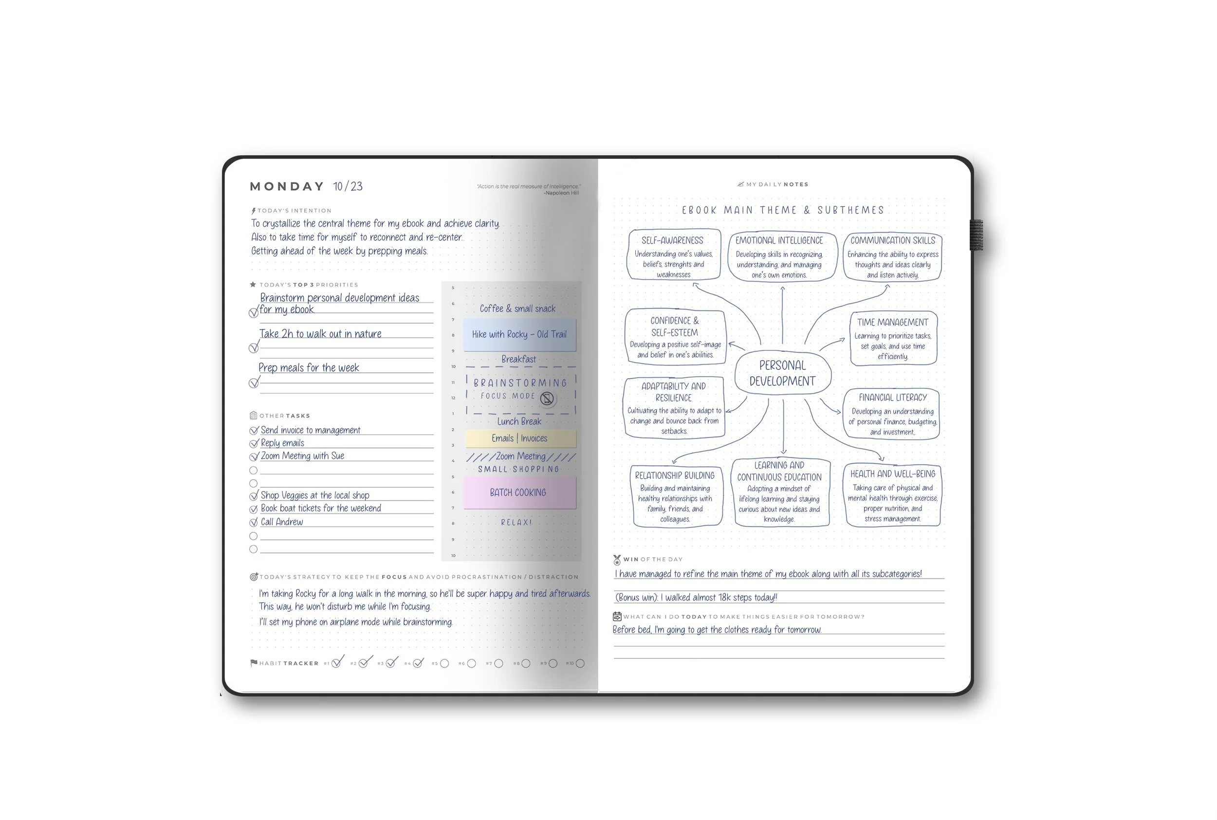 Choose a set time each week—Sunday evening or Monday morning works great—and use the Week Overview section to map out the days ahead. You’ll know the structure of your week in advance, and your brain will already be “primed” for action. Don’t wait until the week starts to plan—it’s far less effective.